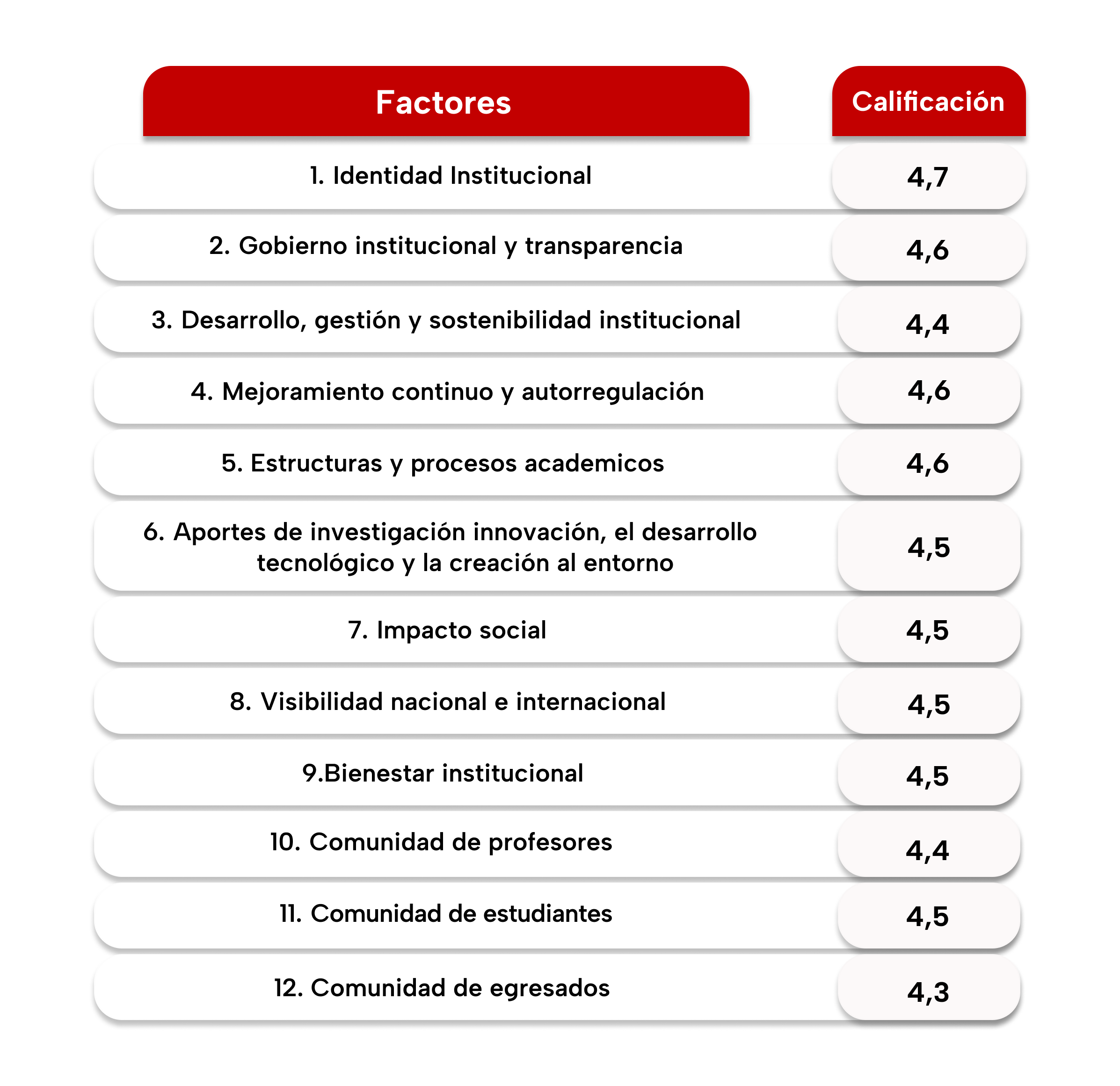 Los resultados cuantitativos del proceso de calificación realizado por los grupos focales, que evaluaron indicadores documentales, así como las calificaciones obtenidas por encuesta emitidas por los distintos estamentos, se registran en la matriz diseñada institucionalmente donde se calcula la relación cuantitativa entre la ponderación previamente definida, la calificación y el logro ideal máximo.
