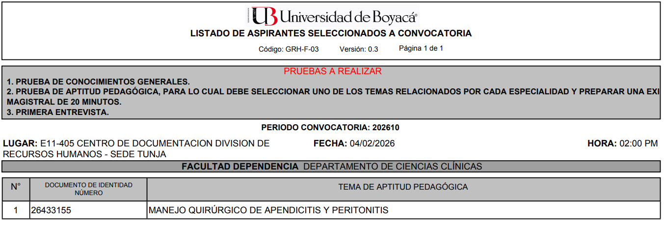 Ingreso de hojas de vida en el aplicativo de la Universidad de Boyacá debidamente soportadas: del miércoles 21 de enero al miércoles 28 de enero de 2026 hasta las 6:00 pm.