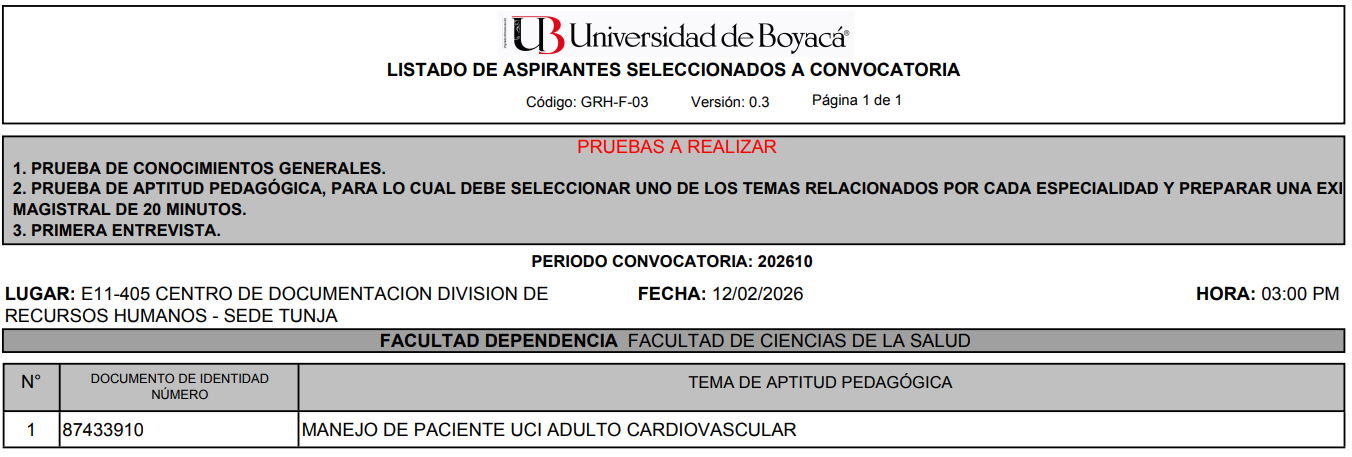 Ingreso de hojas de vida en el aplicativo de la Universidad de Boyacá debidamente soportadas: del jueves 5 de febrero a lunes 9 de febrero de 2026 hasta las 11:59 pm.
