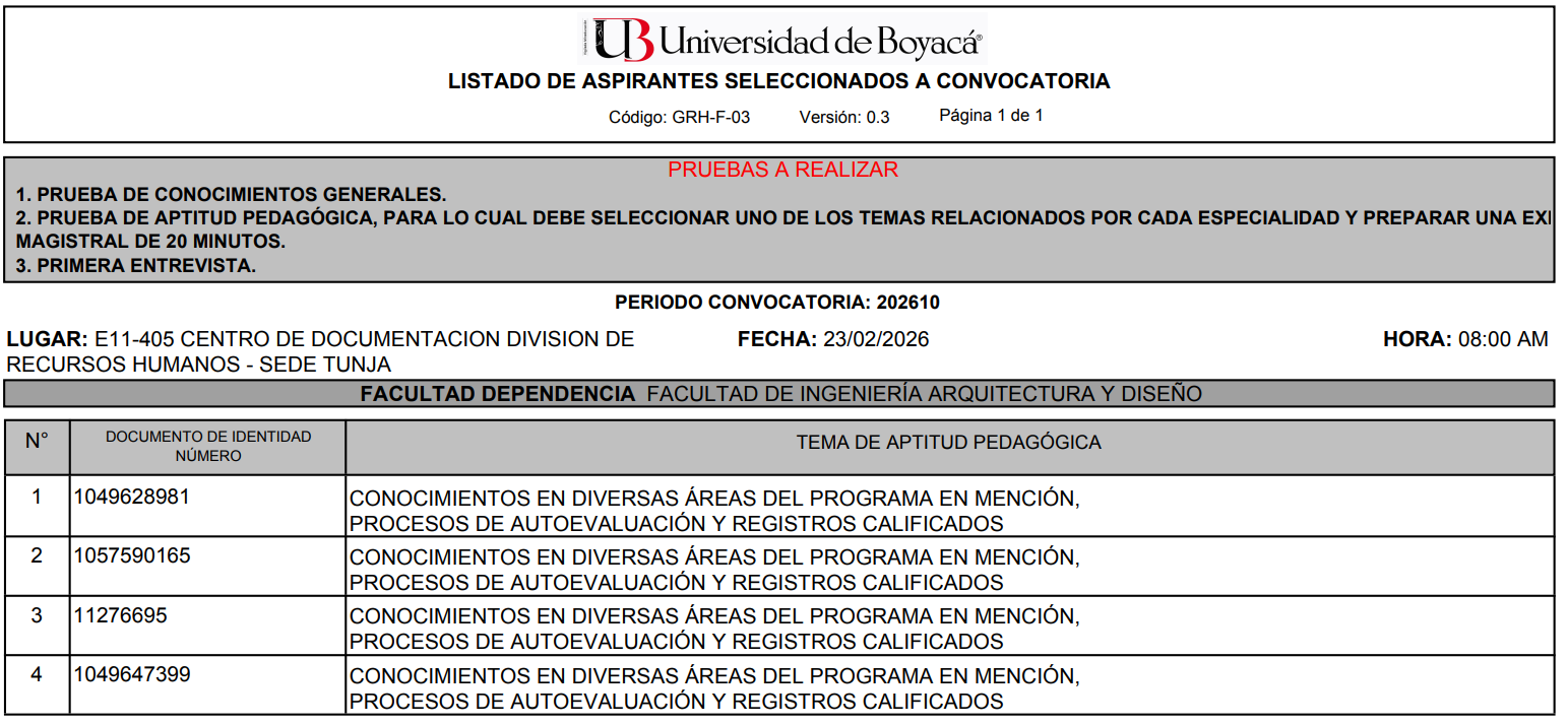 Ingreso de hojas de vida en el aplicativo de la Universidad de Boyacá debidamente soportadas: del viernes 13 de febrero a jueves 19 de febrero de 2026 hasta las 11:59 pm.