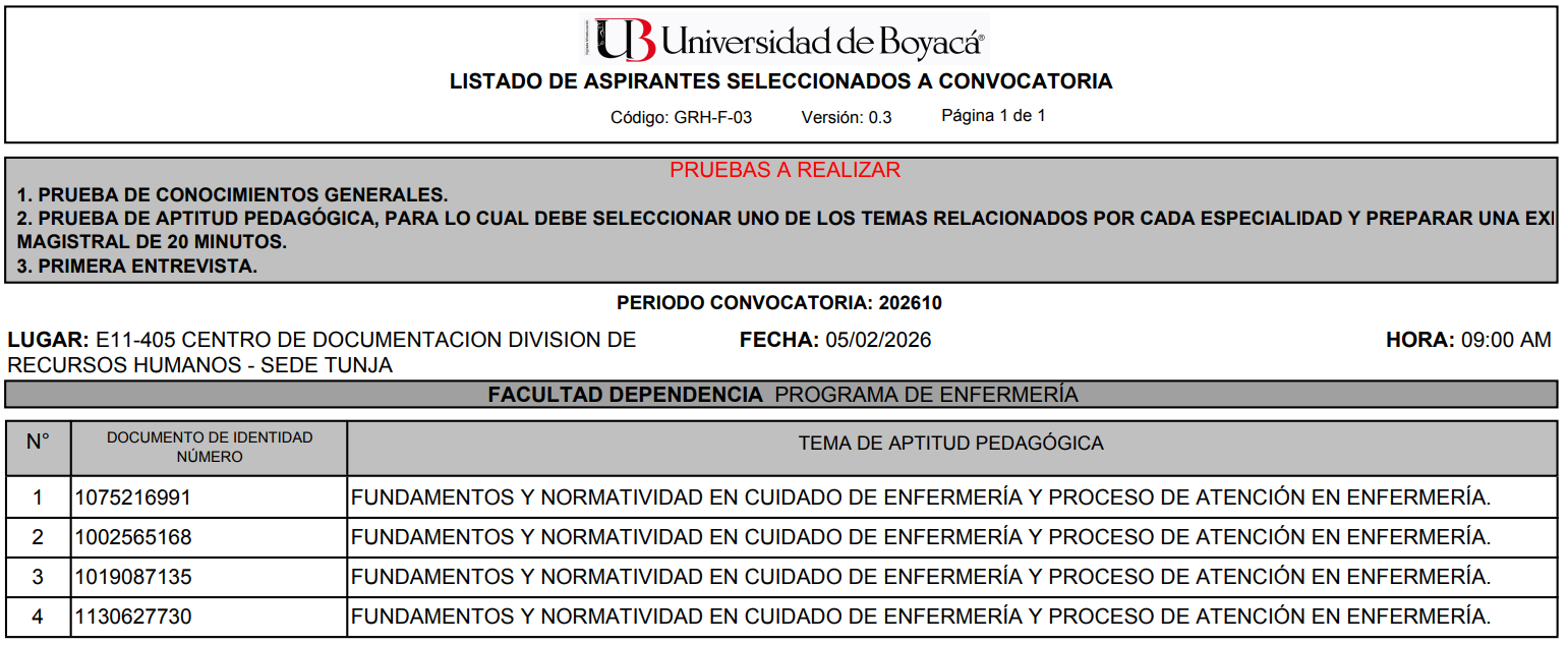 Ingreso de hojas de vida en el aplicativo de la Universidad de Boyacá debidamente soportadas: del sábado 24 de enero a domingo 1 de febrero de 2026 hasta las 11:59 pm.