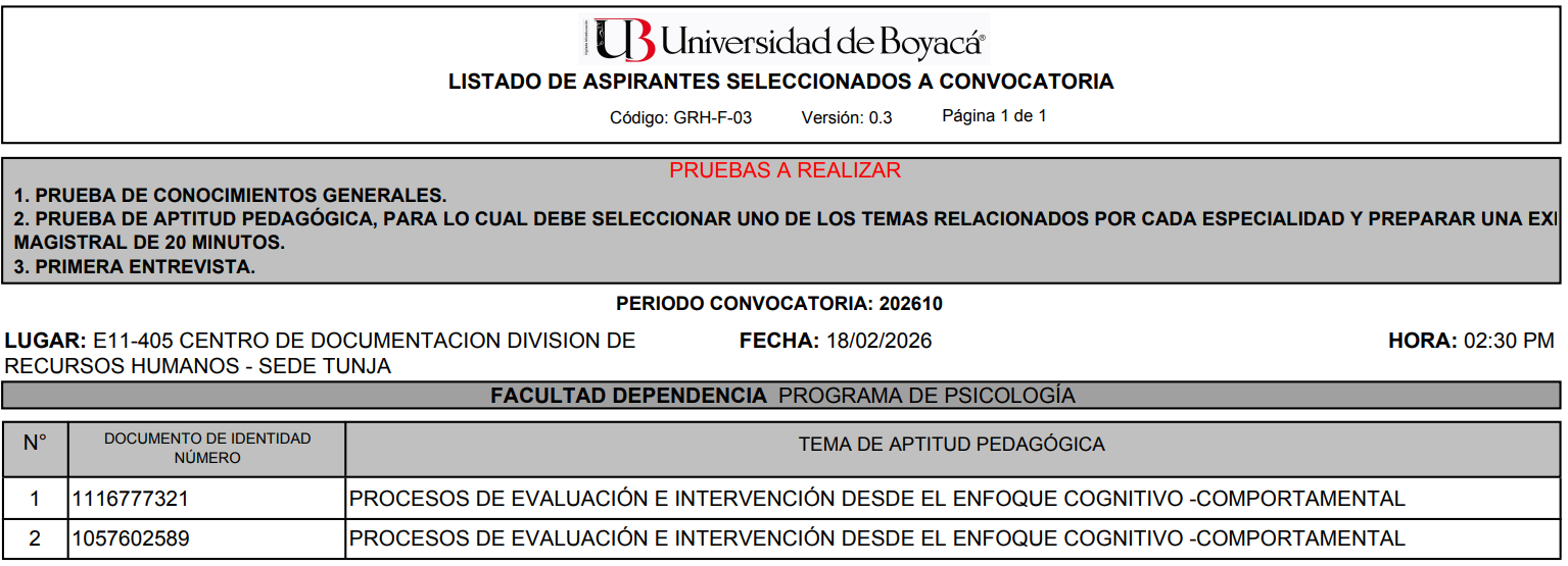 Ingreso de hojas de vida en el aplicativo de la Universidad de Boyacá debidamente soportadas: del jueves 12 de febrero a lunes 16 de febrero de 2026 hasta las 11:59 pm.