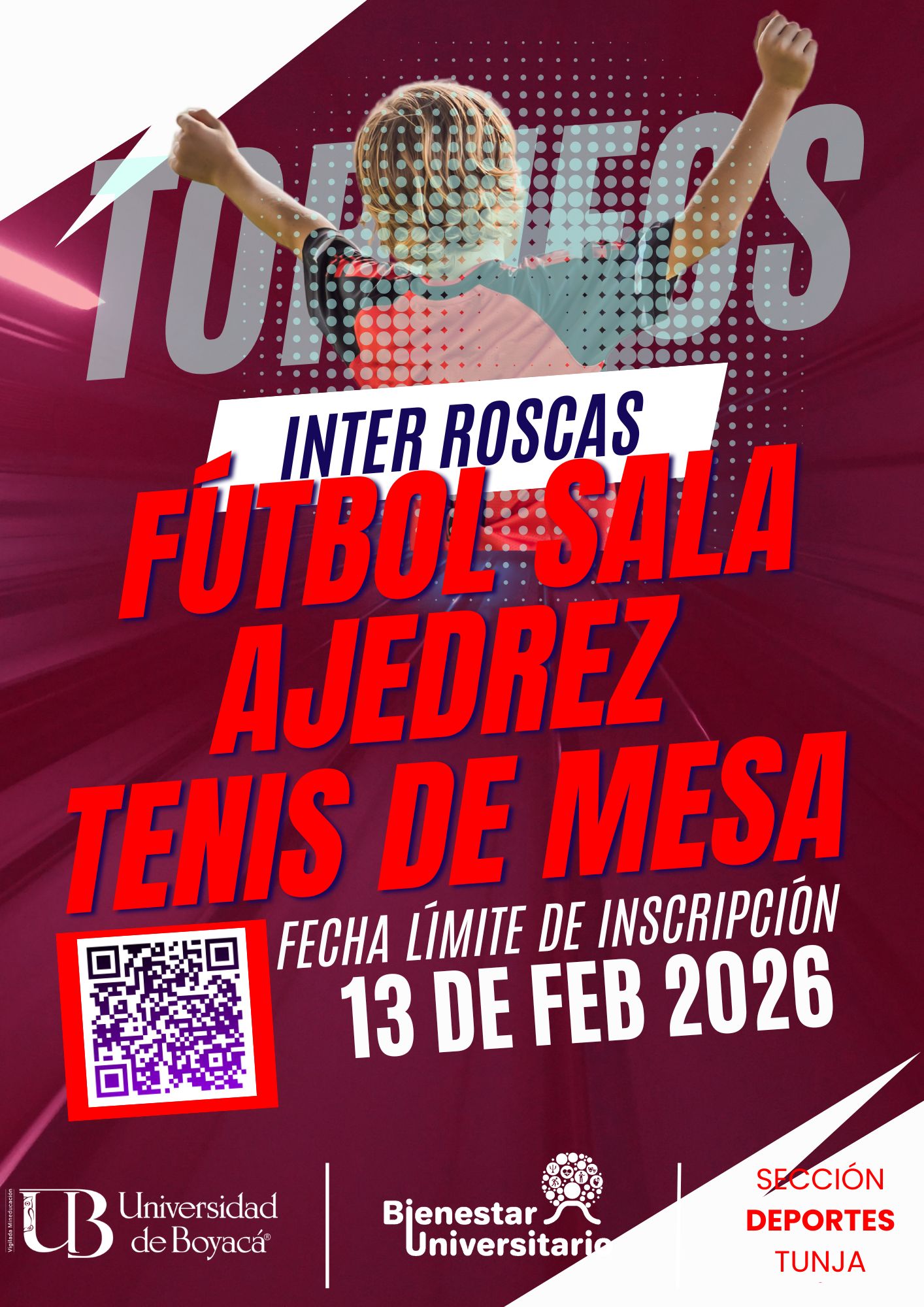 Participa de los Torneos Inter Roscas Tunja 2026 en las categorías: Fútbol Sala, Ajedrez y Tenis de Mesa. Tienes hasta el 13 de febrero para diligenciar el formulario de inscripción. Organiza: Sección Deportes.