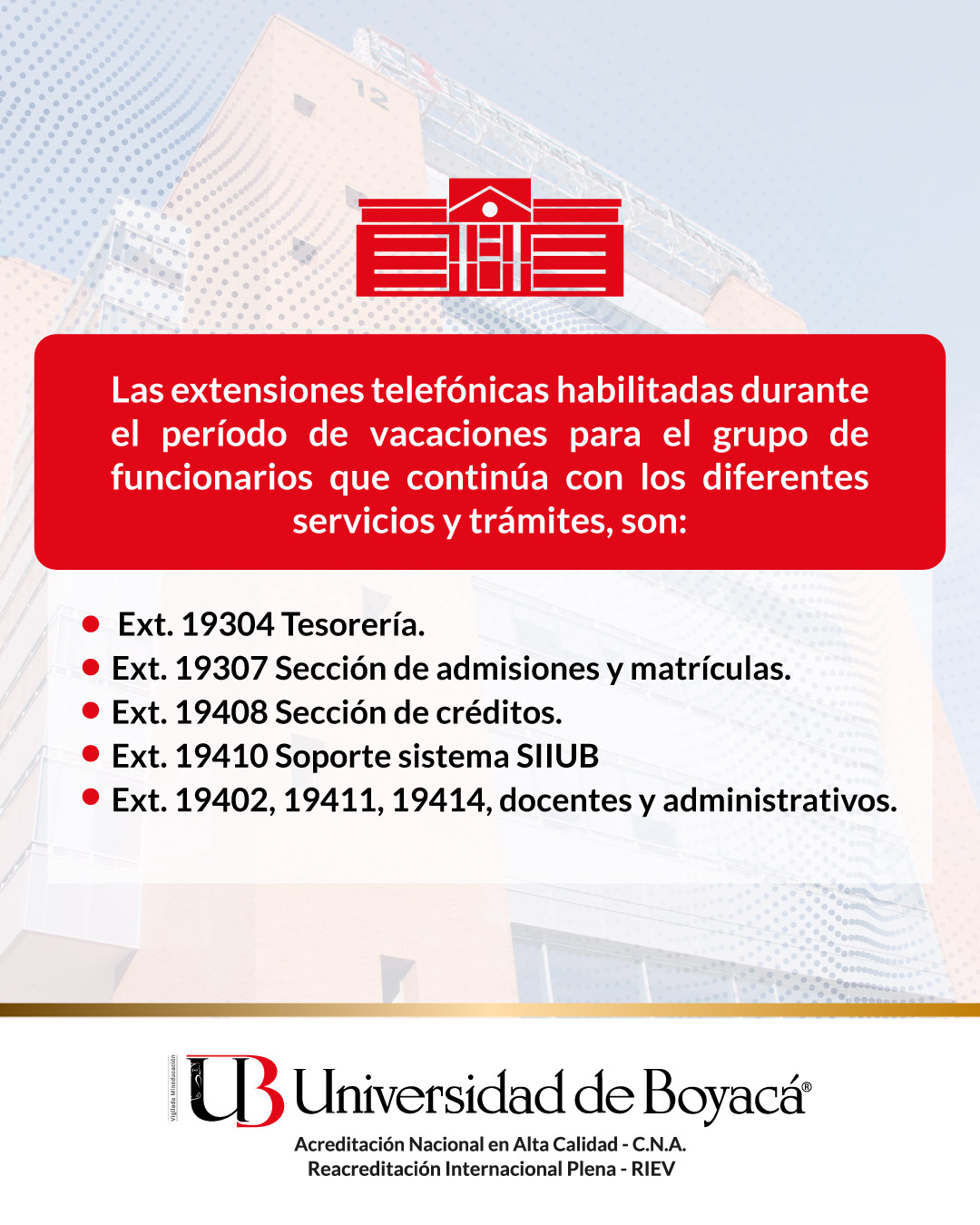 La Universidad de Boyacá, dispone de las siguientes extensiones telefónicas para seguir atendiendo en el proceso de inscripción y matrícula al público en general.