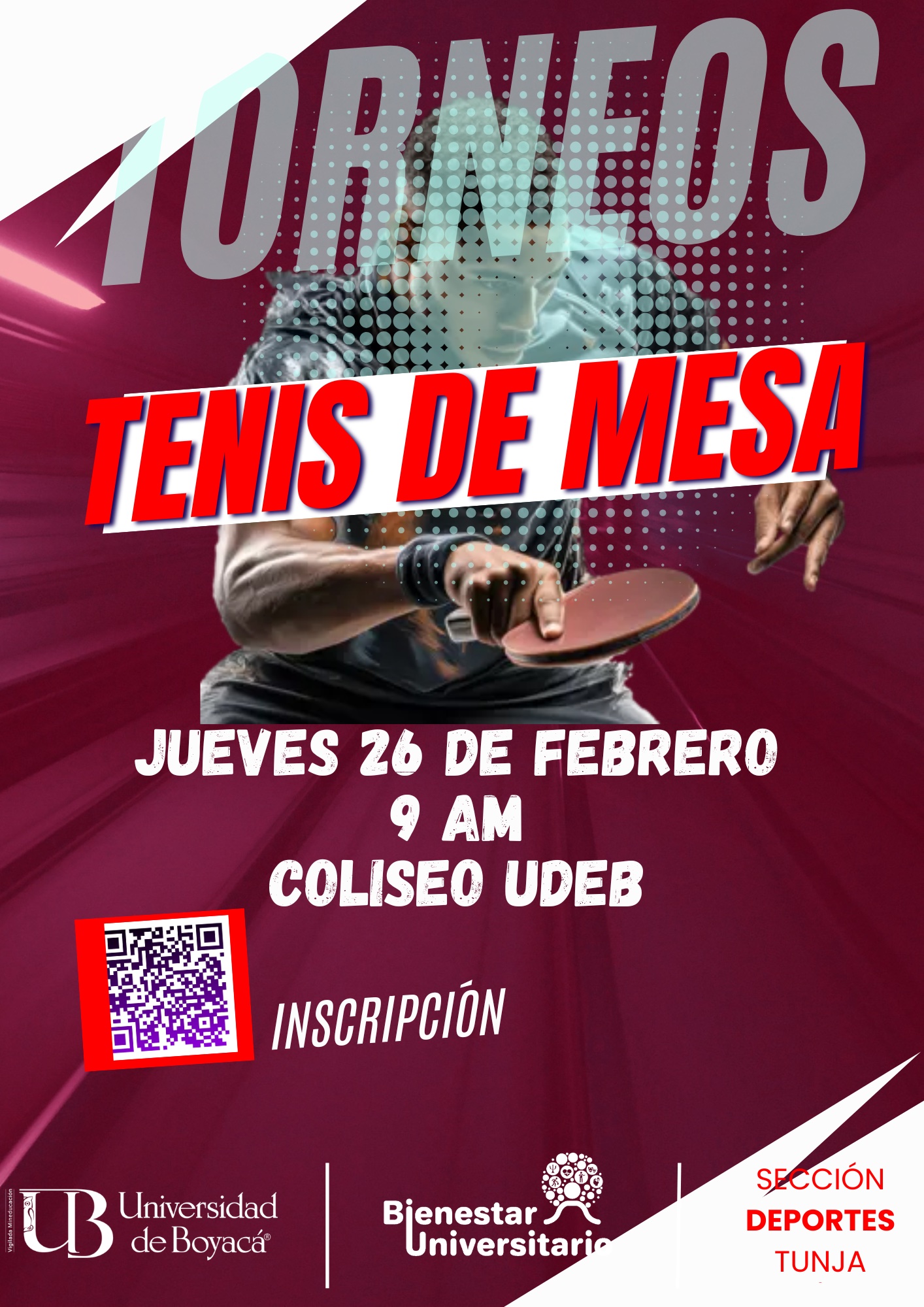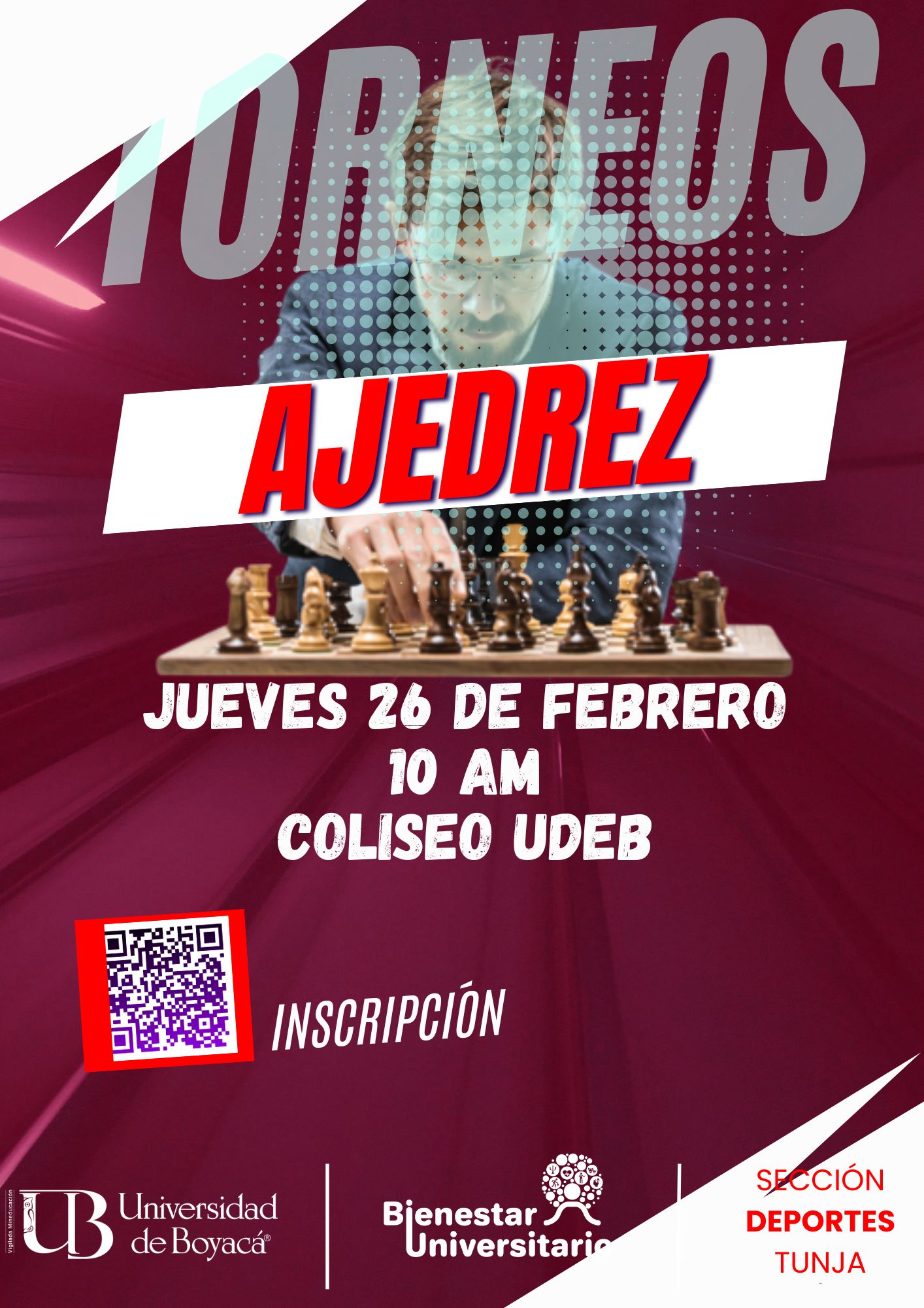 Participa en nuestros torneos internos de Disco volador 4x4, Baloncesto 3x3, Fútbol 7 Femenino y Ajedrez modalidad Blitz, sede Tunja. Este 25 de febrero es la fecha límite para inscribirte con tu equipo. Invita: Sección de Deportes de Bienestar Universitario, sede Tunja.