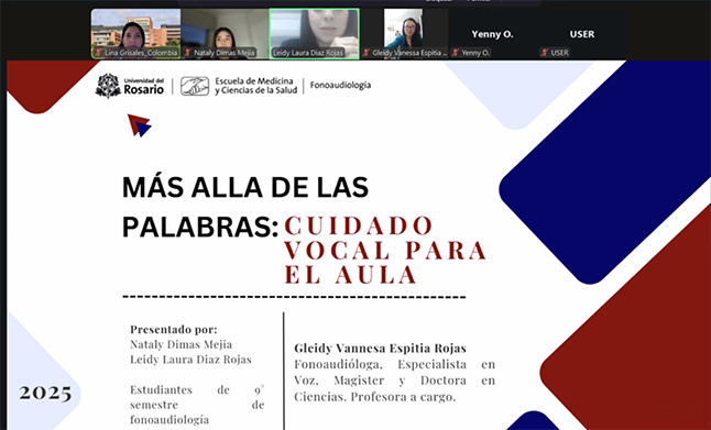 Estudiantes de Administración de Empresas, Administración de Negocios Internacionales e Ingeniería Industrial de la Universidad de Boyacá, junto con estudiantes de Fonoaudiología de la Universidad del Rosario se unieron para desarrollar propuestas orientadas a la Seguridad y Salud en el Trabajo (SST), con énfasis en la protección de la voz de los docentes. Desde la asignatura Administración del Capital Humano —orientada por la docente Lina Grisales— los estudiantes de Administración de Empresas, Administración de Negocios Internacionales e Ingeniería Industrial recolectaron información con docentes activos, identificando hábitos, necesidades y riesgos relacionados con el uso de la voz. Con estos insumos elaboraron mapas de empatía y propuestas de intervención, que luego fueron revisadas y enriquecidas por los estudiantes de Fonoaudiología y carreras afines de la Universidad del Rosario, quienes aportaron su criterio técnico. El ejercicio culminó con un taller virtual liderado por la Universidad del Rosario, abierto al público y que benefició a 35 profesores de instituciones educativas de Boyacá.