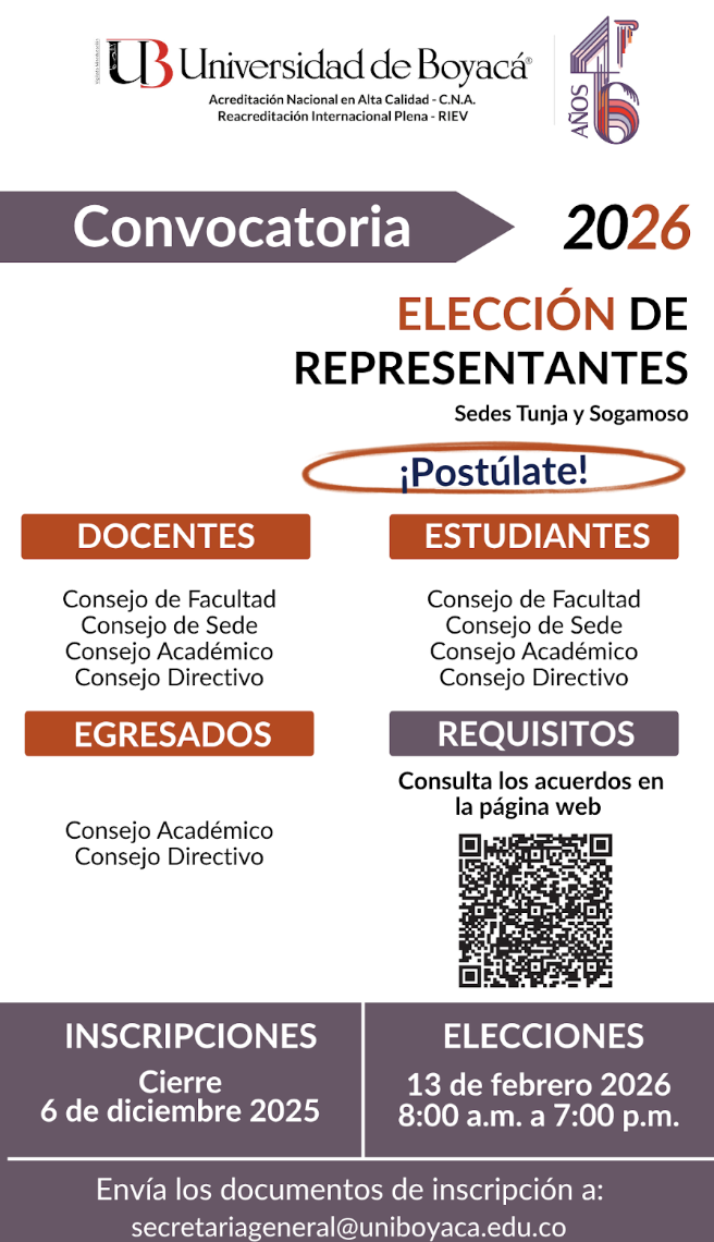 La Universidad de Boyacá informa que se amplió la convocatoria para la elección de representantes 2026 en las sedes Tunja y Sogamoso. Esta extensión ofrece una nueva oportunidad para que docentes, estudiantes y egresados participen activamente en los órganos colegiados y contribuyan al fortalecimiento de la dinámica universitaria.
