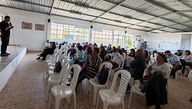 La Institución Educativa Integrado de Cómbita fue escenario de la charla “Lenguajeaderos y habladurías: amores, chismes y malentendidos entre la comunicación y la escuela”, una iniciativa académica de la Universidad de Boyacá orientada a reflexionar de manera creativa y crítica, sobre las posibilidades didácticas del encuentro entre los medios, la tecnología y la pedagogía. La conferencia fue realizada por el docente del programa de Comunicación Social, Jaime Pulido, e impartida a los docentes de la institución educativa, quienes manifestaron su agrado de poder apropiar metodologías de trabajo para el uso de la radio, el cine y la prensa en la generación de nuevas experiencias de aprendizaje para sus estudiantes. Este espacio académico es la apertura al proyecto de reactivación de la emisora escolar en la institución educativa que realizará el estudiante Daniel Felipe Flórez del semillero de investigación Kinoks.