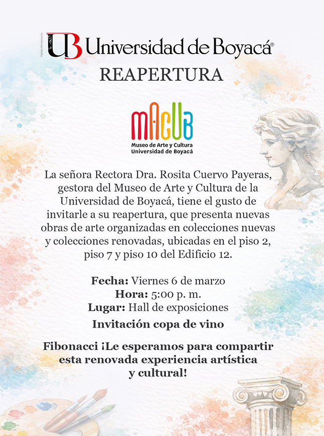 Mañana, viernes 6 de marzo, las directivas de la Universidad de Boyacá, en cabeza de la señora rectora, Dra. Rosita Cuervo Payeras —gestora y fundadora del Museo de Arte y Cultura (MACUB)—, llevarán a cabo la reapertura general y la inauguración de este centro de difusión artística, abierto a la comunidad universitaria y al público en general. A partir de las 5:00 p.m., los asistentes podrán apreciar las nuevas obras en el Hall de las Artes Fibonacci, ubicado en el segundo piso del edificio 12, en el campus universitario de Tunja. De igual manera, hoy jueves a las 4:00 p.m., la comunidad podrá visitar la exposición Ubi Aves Cantare “Donde las aves cantan”, del docente del programa de Diseño Gráfico, Javier Pinzón Rodríguez.