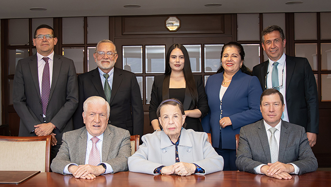 Integrantes del Consejo Directivo: (arriba de izq. a der.) Ing. Carlos Lara Mendoza, representante de los egresados; Dr. Manuel Bernal García, representante de la comunidad académica, Yeimi Vargas Aranda, representante de los estudiantes; Dra. Ethna Romero Garzón, Secretaria General; Dr. Ricardo Cifuentes Osorio, representante de los docentes. (abajo de izq. a der.) Dr. Osmar Correal Cabral, presidente; Dra. Rosita Cuervo Payeras, rectora; Ing. Rodrigo Correal Cuervo, vicepresidente.