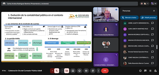En el marco del Día del Contador, la Universidad de Boyacá realizó el conversatorio virtual “Avances y perspectivas de la información contable en el sector público”, organizado por el programa de Contaduría Pública en modalidad presencial y virtual, el cual contó con una destacada participación académica. Durante el encuentro, el Contador General de la Nación, quien fue el invitado especial, abordó la evolución y los principales desafíos de la información financiera en el sector público, destacando el papel fundamental de la contabilidad en la transparencia y en el fortalecimiento del control estatal. Asimismo, se presentó un recorrido histórico desde los orígenes de la contabilidad hasta prácticas modernas como la partida doble y el devengo, al tiempo que se analizaron los procesos de estandarización internacional a través de marcos normativos como IFRS e IPSAS. En el contexto colombiano, se revisó la evolución institucional y los procesos de armonización normativa, identificando retos actuales relacionados con la sostenibilidad, la calidad y la comprensión de la información contable pública.